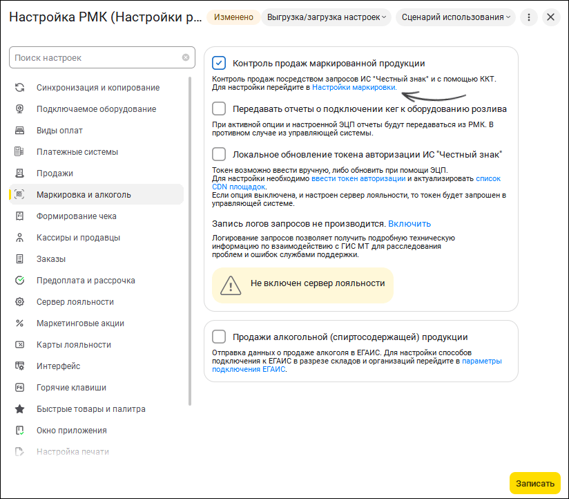 Для настройки ТС ПИоТ нужно в разделе «Маркировка и алкоголь» настроек РМК перейти по ссылке «Настройки маркировки».