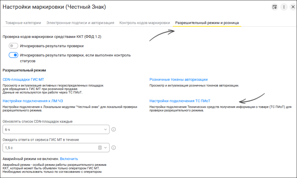 В открывшемся окне на закладке «Разрешительный режим и розница» перейдите по ссылке «Настройки подключения ТС ПИоТ».