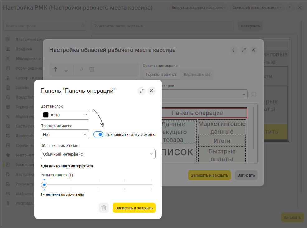 Для удобства работы кассира можно настроить отображение состояния интеграции с ТС ПИоТ, которое включается вместе с отображением статуса смены ККТ в разделе «Окно приложения» настроек РМК. Нажимаем «Настроить» и редактируем «Панель операций».