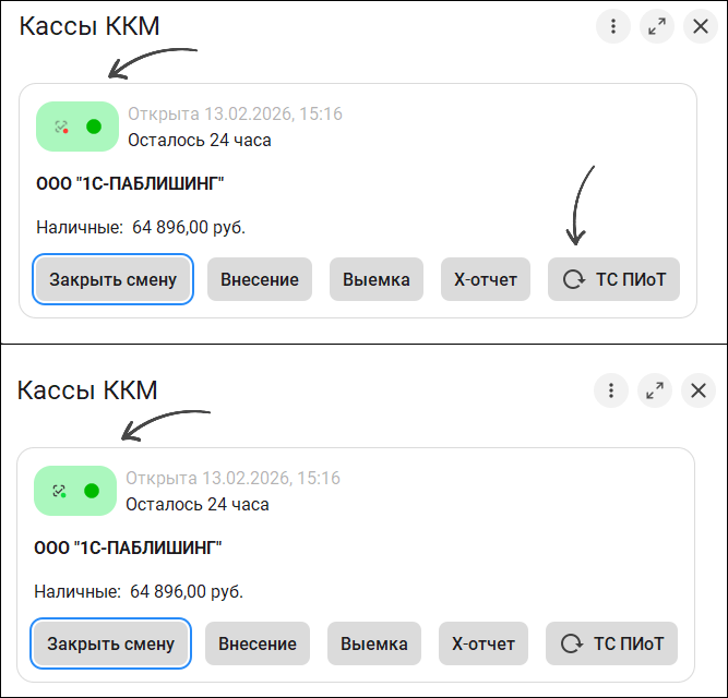 На экране кассира появится иконка со статусом подключения ТС ПИоТ. Статус работы ТС ПИоТ отображается и на форме выбора ККТ в начале работы и при завершении смены. Для обновления статуса предназначена отдельная команда.