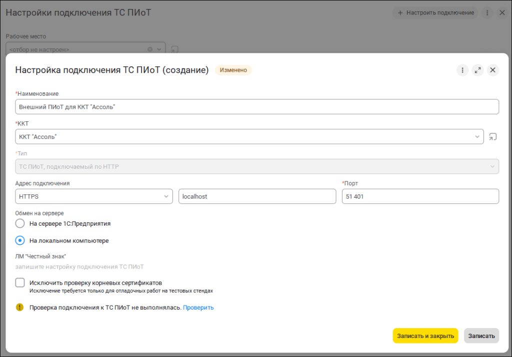 По команде «Создать» открывается окно настроек, где необходимо выбрать рабочее место из списка настроенных и заполнить параметры подключения. ТС ПИоТ может быть настроен как на клиенте, так и на сервере. Адрес подключения заполняется по умолчанию. При выполнении настройки на тестовом стенде необходимо установить флажок «Исключить проверку корневых сертификатов». После заполнения всех полей нужно нажать ссылку «Проверить» и убедиться в корректности настроек подключения.