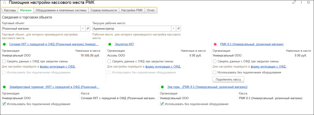 При выборе типа «фискальный регистратор» в форме создания будет отображено количество разделов по количеству касс ККМ, у которых не подключено оборудование или не установлен признак «Использовать без подключения оборудования». При настройке платежных систем также необходимо выбрать флажками и уже на знакомой форме ввести параметры подключения.