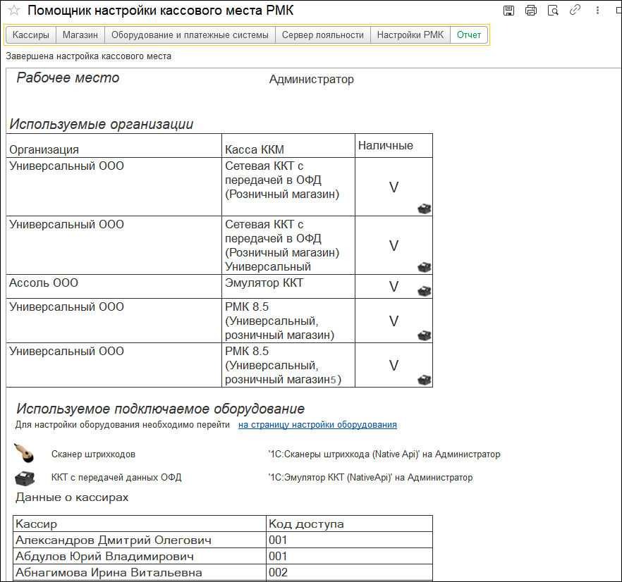 Обновленный процесс настройки реализован без последовательных команд «Далее» и «Назад»и обязательного заполнения данных для движения по шагам. Можно начать настройку с любого этапа, пропуская шаги, не относящиеся к конкретному магазину. Все этапы, например, «Кассиры», «Магазин», выведены в виде переключателей вверху страницы в порядке убывания важности для начала работы.