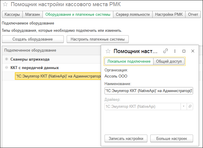 Следующий этап настройки – «Оборудование и платежные системы». На одной странице доступно подключенное оборудование в виде дерева. При необходимости можно создать новое оборудование и настроить платежную систему. При выборе оборудования открывается карточка с основными параметрами, перейти к более детальным настройкам можно по кнопке «Больше настроек».