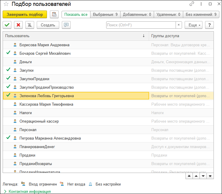 Программа позволяет создавать код сотрудника и выводить его на печать. В «Группу доступа» сотрудников можно добавлять через функцию подбора пользователей. Здесь же показываются уже добавленные пользователи. Удаление из группы выполняется нажатием на значок «Крестик».