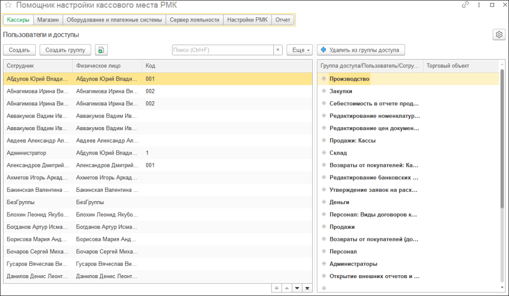 В ключевом разделе настройки РМК «Кассиры» мы переработали основные команды. Теперь можно добавить одного кассира или сразу несколько. Для этого необходимо выделить одного или несколько сотрудников в левой таблице, выбрать группу доступа в дереве справа и выполнить команду «Включить в группу». Добавленные кассиры должны появится справа в группе доступа.