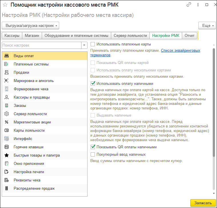 Если был подключен эквайринговый терминал, то в настройках РМК будет автоматически установлен флажок «Использовать платежные карты».