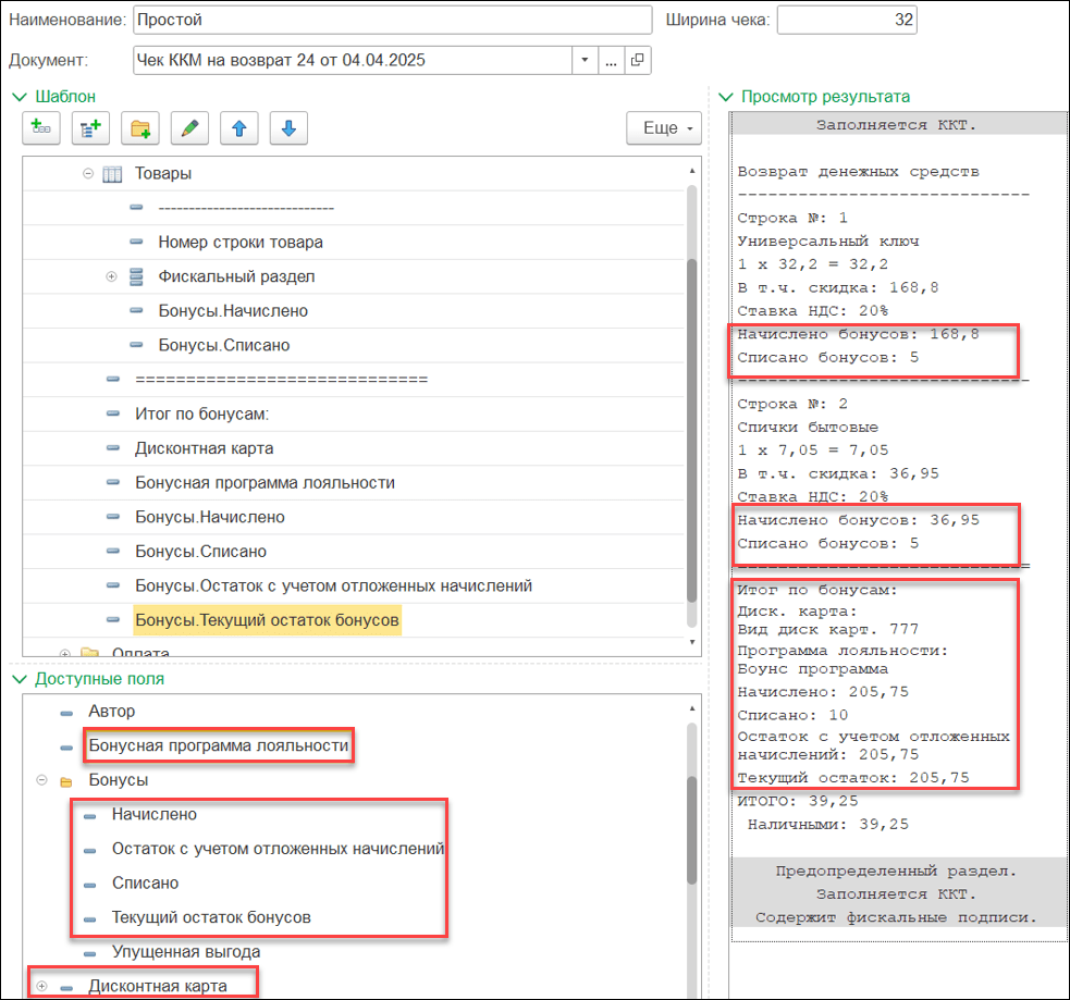 Здесь же появился новый и более понятный заголовок «Сумма скидки за дисконтную карту». Реализован вывод данных по бонусам для чека возврата. В примере ниже текстовое описание отображения полей добавлено вручную.