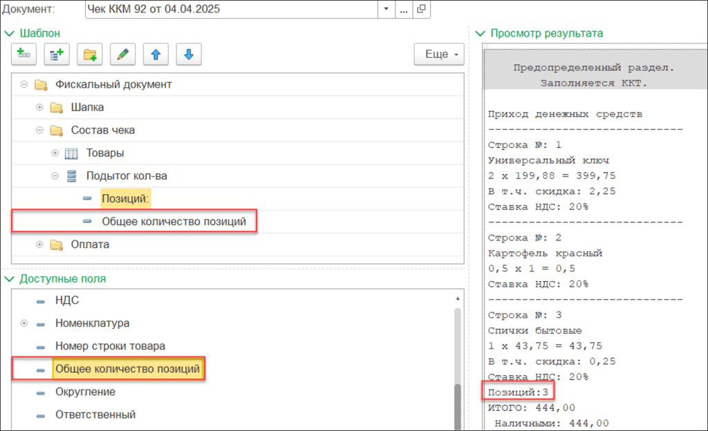 В программе «1С:Управление нашей фирмой» начиная с версии 3.0.12 сделали информативнее работу с чеками. В настройки шаблона чека добавлен показатель «Общее количество позиций».