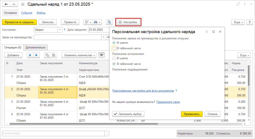 Также в документ «Сдельный наряд» дополнены персональные настройки отображения полей и таблиц документа.