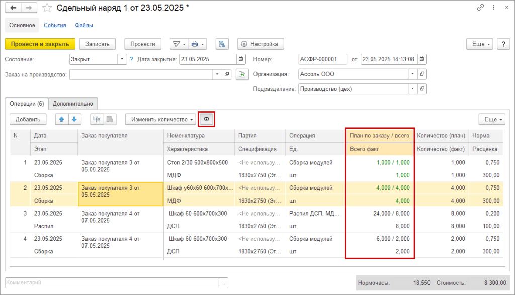 В документе «Сдельный наряд» появился режим отображения «Показать остатки», в котором можно увидеть количество операций, запланированных по заказу, и количество, выполненных другими сдельными нарядами. Зеленый цвет текста информирует, что заказ выполнен в полном объеме.