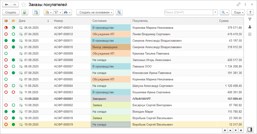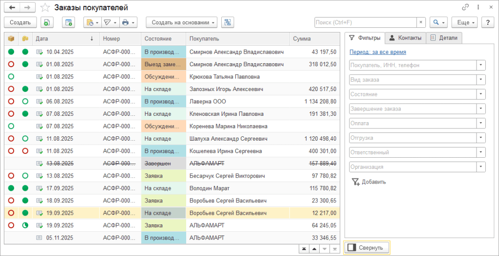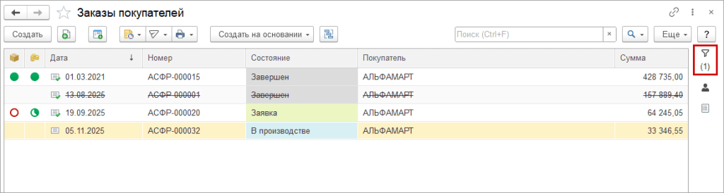 В программе «1С:Управление нашей фирмой» начиная с версии 3.0.13 в списках реализовано несколько изменений, рассмотрим которые на примере списка заказов покупателей.