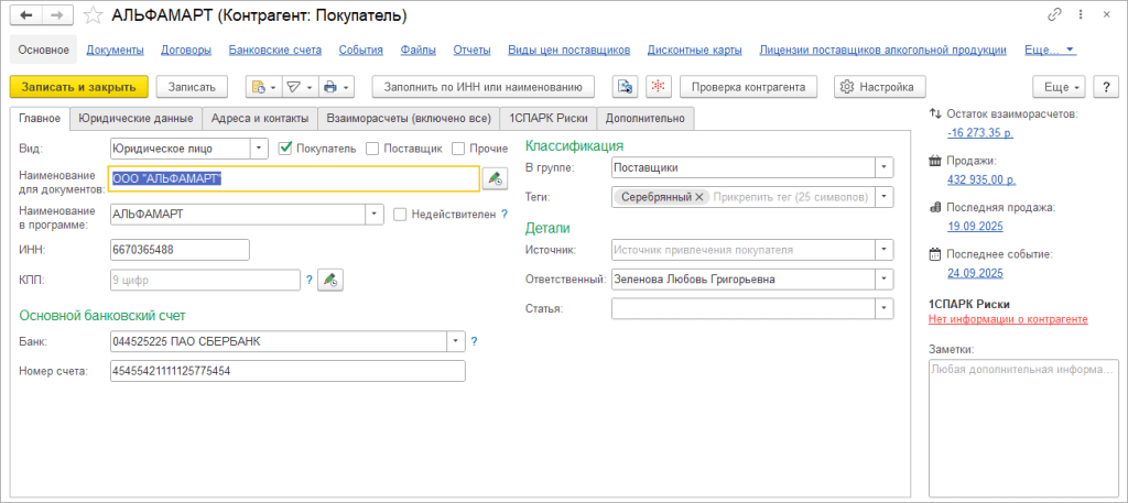 Полная информация о контрагенте теперь расположена на отдельных закладках: юридические данные, адреса и контакты, взаиморасчеты, досье 1СПАРК Риски.
