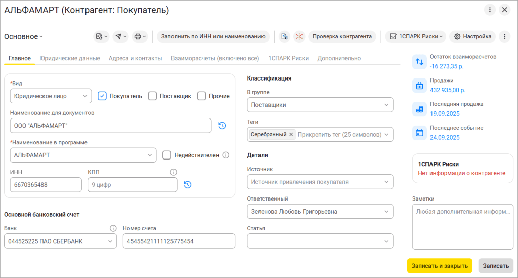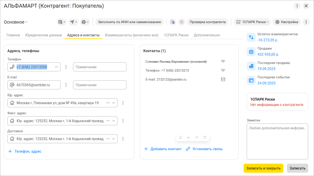 Детальная информация о контрагенте размещена на отдельных закладках: юридические данные, адреса и контакты, взаиморасчеты, досье 1СПАРК Риски. При этом логика работы, например, заполнение контактных лиц, не изменилась.