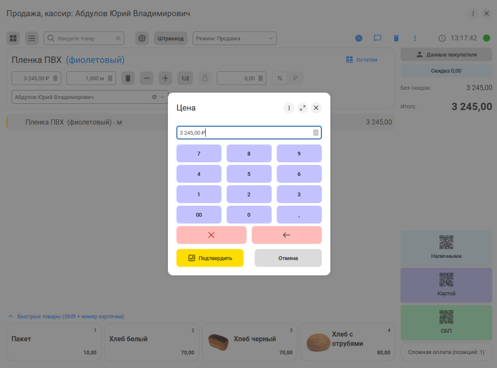 При активации клавиатуры или наведении курсора на цифровое поле сразу открывается окно для ввода значения. В названии окна отображается вводимый элемент, например, на рисунке ниже редактируется «Цена».