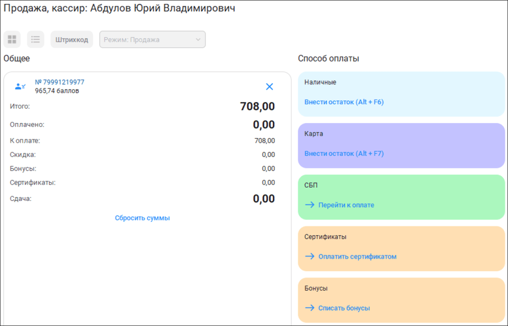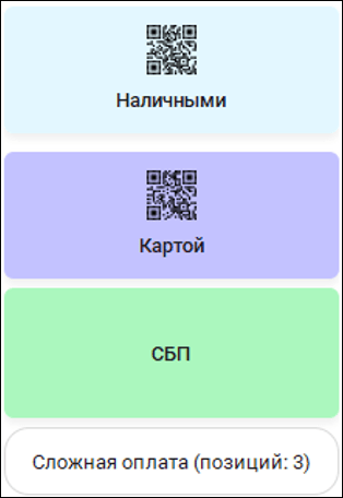 Цвета разделов «Наличные»,»Карта» и «СБП» совпадают с цветами кнопок быстрых оплат.