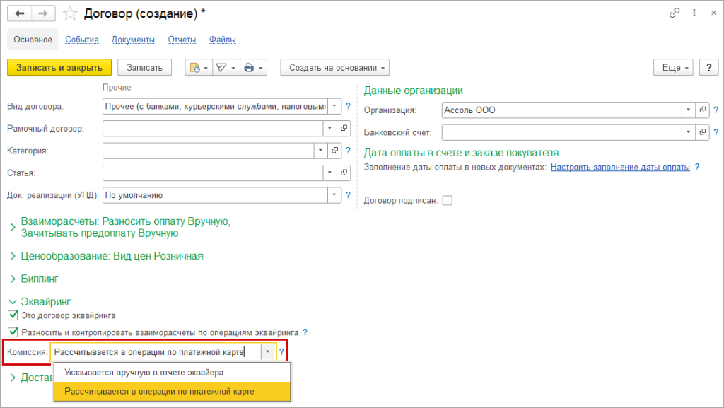В договоре эквайера можно указать различные варианты расчета комиссии: рассчитывать в операции эквайринга или указывать вручную в отчете эквайера.