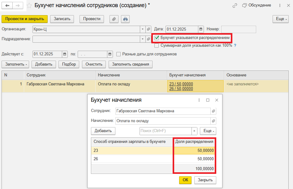 При установленном флаге Суммарная доля указывается как 100% суммарная доля распределения по сотруднику должна равняться 100.