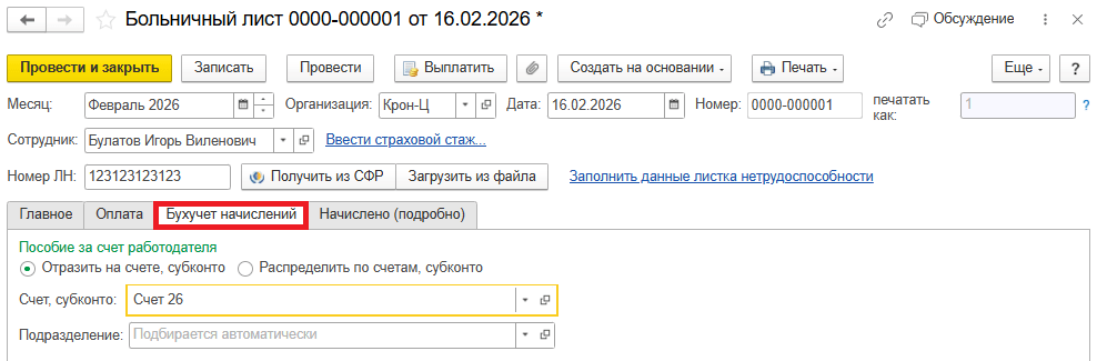 Рис. Новая закладка «Бухучет начислений» в документе «Больничный лист» в программе «1С:Зарплата и управление персоналом 8» ред. 3