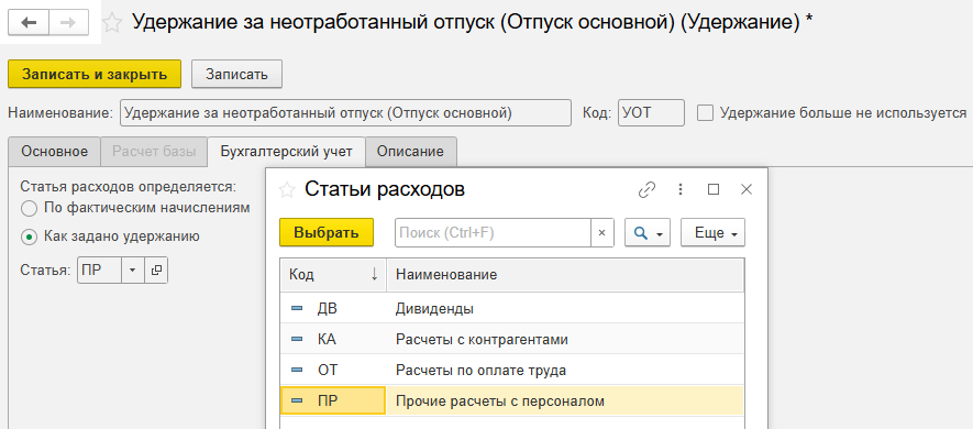 Для этого в карточку Удержания (раздел Настройка) на вкладку Бухгалтерский учет добавлены новые переключатели.