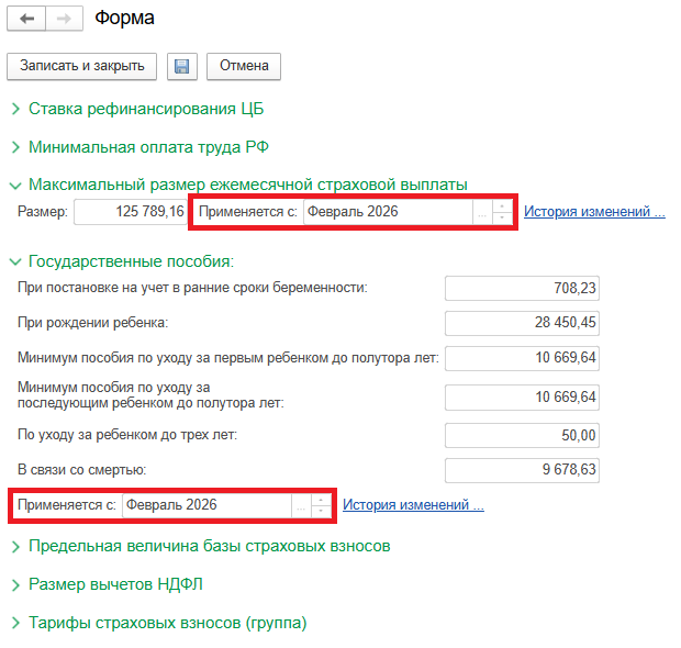 Начиная с версий 3.1.34.197 и 3.1.36.75 в программе «1С:Зарплата и управление персоналом 8» ред. 3 произведено повышение размеров государственных пособий на 5,6% с февраля 2026 года в соответствии с постановлением Правительства РФ от 23.01.2026 №30. В частности, увеличены: