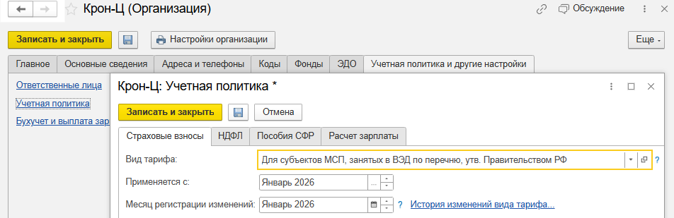 Если организация имеет право на льготу с 2026 года, в настройках учетной политики (раздел Настройка – Предприятие – Организация – Учетная политика и другие настройки – Учетная политика – Страховые взносы) следует установить новый вид тарифа Для субъектов МСП, занятых в ВЭД по перечню, утв. Правительством РФ, с января 2026 года.
