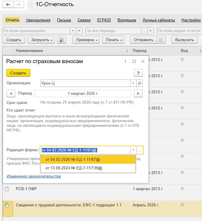 Начиная с версий 3.1.34.251 и 3.1.37.49 в программе «1С:Зарплата и управление персоналом 8» ред. 3 выполнено обновление и автоматическое заполнение новой формы расчета по страховым взносам, утв. приказом ФНС России от 04.02.2026 №ЕД-1-11/67@, которая автоматически заменила в списке рекомендованную форму РСВ в соответствии с письмом ФНС России от 22.12.2025 №БС-4-11/11504@.