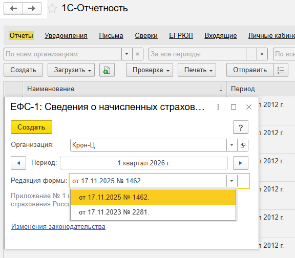 Начиная с версий 3.1.34.253 и 3.1.37.54 в программе «1С:Зарплата и управление персоналом 8» ред. 3 выполнено обновление и автоматическое заполнение Раздела 2 новой формы ЕФС-1, утв. приказом СФР от 17.11.2025 №1462, а также соответствующий формат электронного представления, утв. приказом СФР от 17.11.2025 №1463.