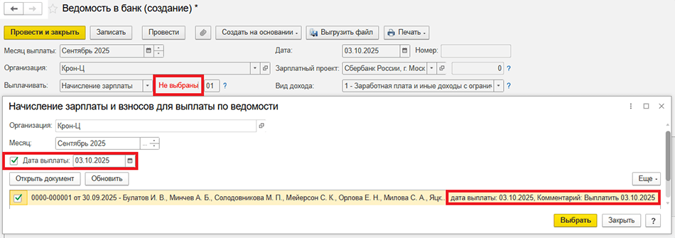 Также в открытой форме выбора основания для выплаты по ведомости добавлена возможность отбора документов по дате выплаты.