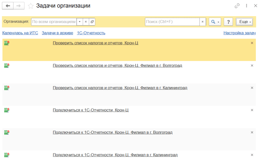 В открытом окне формы доступен список задач по ведению учета, сдачи отчетности и другим важным операциям с указанием статуса и крайнего срока их выполнения. Задачи группируются в хронологическом порядке и отражаются автоматически на основании зарегистрированных документов, сведений и загруженных данных.