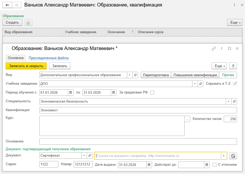 В карточке сотрудника или физического лица (раздел Кадры) по ссылке Образование, квалификация для каждого вида образования можно указать сертификат в качестве документа, подтверждающего получение образования. Также предусмотрено добавление ссылки на электронный документ и установка даты окончания действия в поле Действует до.