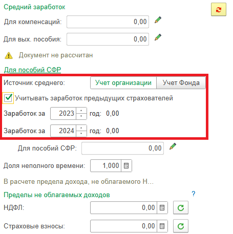 Для этого в документе Увольнение по ссылке Для пособий СФР следует установить одноименный флаг Учитывать заработок предыдущих страхователей.