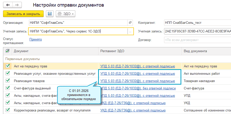 В программе «1С:Бухгалтерия 8» начиная с версии 3.0.189 1 января 2026 года автоматически установлен во всех настройках ЭДО формат УПД 5.03 для товарной накладной и акта выполненных работ в связи с отменой этих форматов (приказ ФНС России от 20.01.2025 № ЕД-7-26/28@).