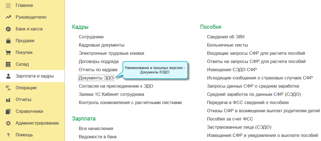В программе «1С:Бухгалтерия 8» начиная с версии 3.0.181 вместо аббревиатуры «КЭДО» теперь используется «ЭДО», так как электронный документооборот через сервис 1С:Кабинет сотрудника расширен с только кадровых документов на другие, связанные с работой (договоры ГПХ, локальные нормативные акты и другие).