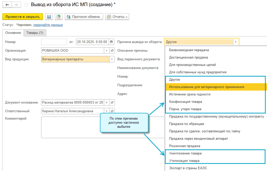В программе «1С:Бухгалтерия 8» начиная с версии 3.0.185 добавлена возможность передавать в ГИС МТ «Честный знак» данные о частичном выбытии товаров из группы Ветеринарные препараты.