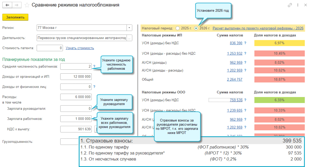 В программе «1С:Бухгалтерия 8» начиная с версии 3.0.187 поддержано доначисление базы для расчета страховых взносов за руководителя до уровня МРОТ по проекту налоговой реформы в обработке Сравнение режимов налогообложения (для случаев, когда расчет производится для 2026 года и зарплата руководителя ниже МРОТ). Этот порядок применяется для общей и упрощенной системы налогообложения.