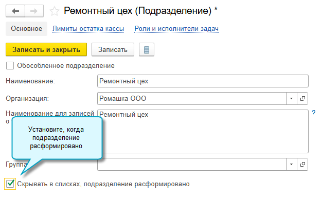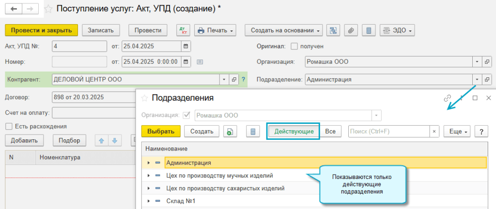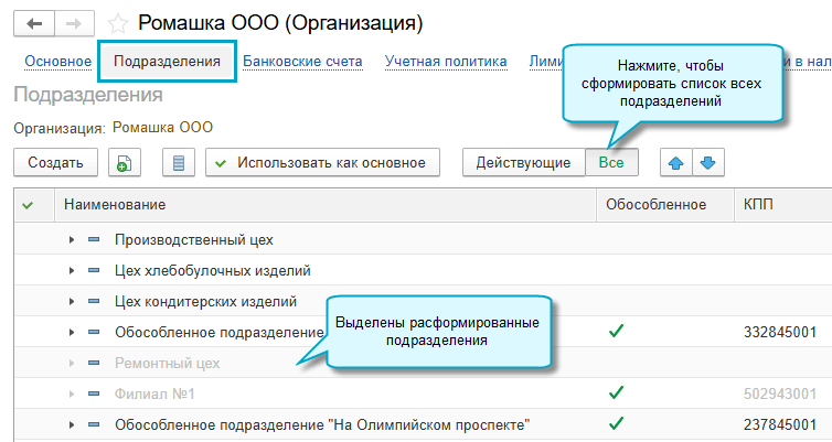 В программе «1С:Бухгалтерия 8» начиная с версии 3.0.176 добавлена возможность показывать только действующие подразделения организации при их выборе в документах и отчетах. Для этого достаточно помечать расформированные подразделения.
