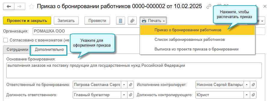 В программе «1С:Бухгалтерия 8» начиная с версии 3.0.170 добавлена возможность оформить приказ о бронировании работников.