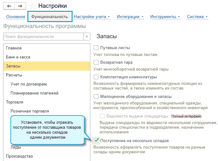Простой интерфейс: меню «Настройки – Функциональность – Запасы».
