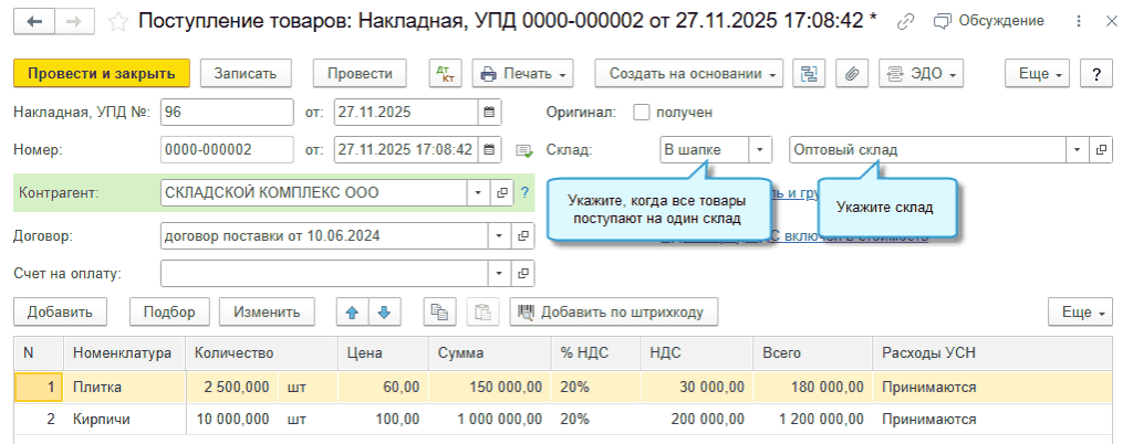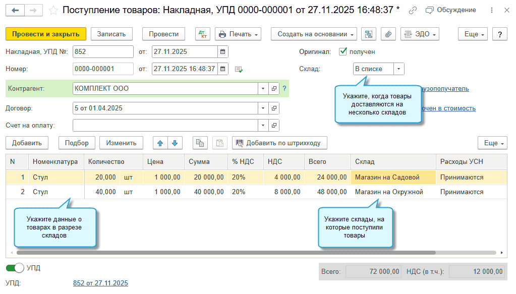 В программе «1С:Бухгалтерия 8» начиная с версии 3.0.188 добавлена возможность использовать один документ поступления товаров в тех случаях, когда поставщик выдает один УПД (накладную), а организация оформляет несколько Приходных ордеров (М-4), потому что товары поступают на несколько разных складов. Теперь для отражения таких ситуаций не требуется проводить дополнительные перемещения товаров между складами.