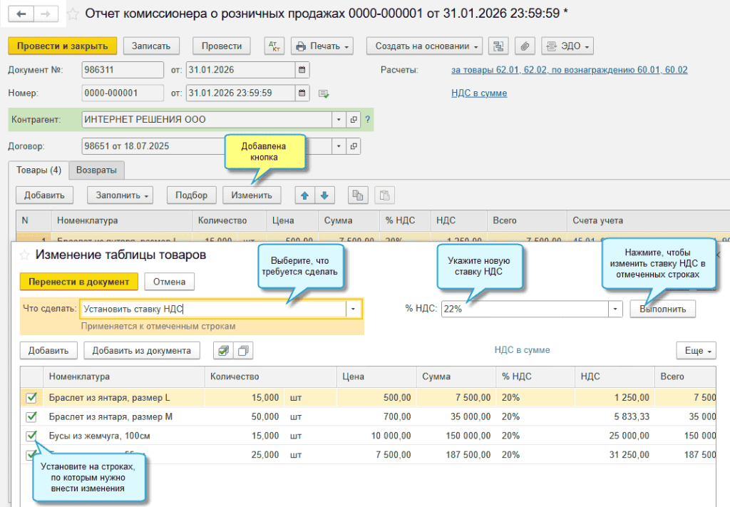 В программе «1С:Бухгалтерия 8» начиная с версии 3.0.192 добавлена возможность выполнять групповое изменение данных по товарам в отчете комиссионера о розничных продажах. Например, для всех товаров вместо ставки НДС 20% установить ставку 22%.