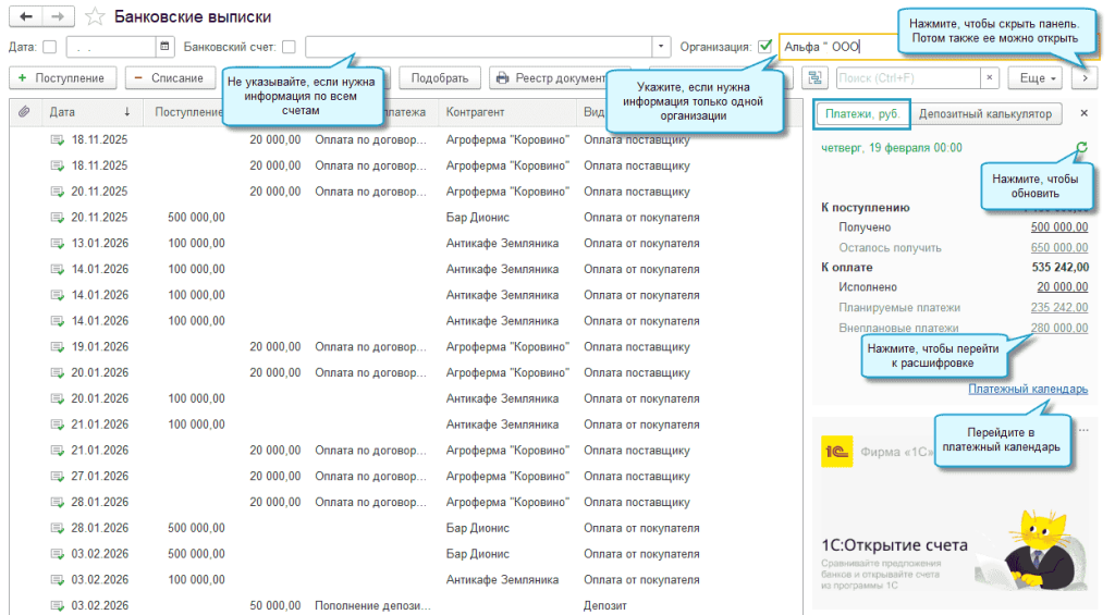 Для этого в журнал банковских выписок и платежных поручений добавлена панель справа. Если подключен сервис 1С:ДиректБанк с банками, которые поддерживают оформление заявок на депозит, то доступен также депозитный калькулятор для быстрого расчета условий депозита.