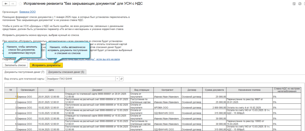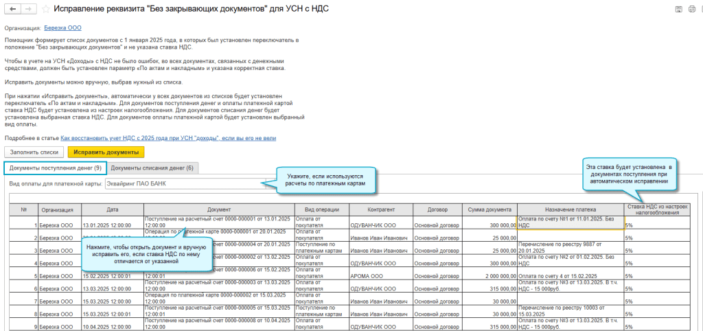 Перед автоматическим исправлением может потребоваться ручная корректировка отдельных документов поступления и списания денег.