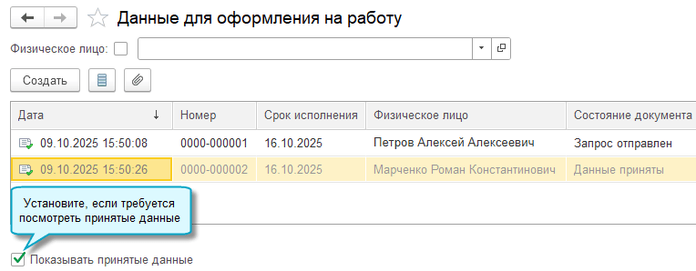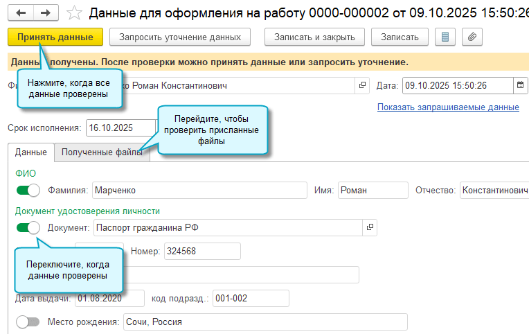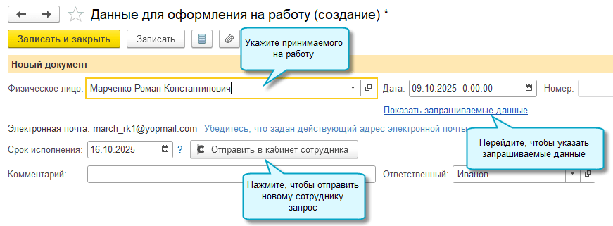 Полный интерфейс: меню «Зарплата и кадры – Кадры – Данные для оформления на работу».