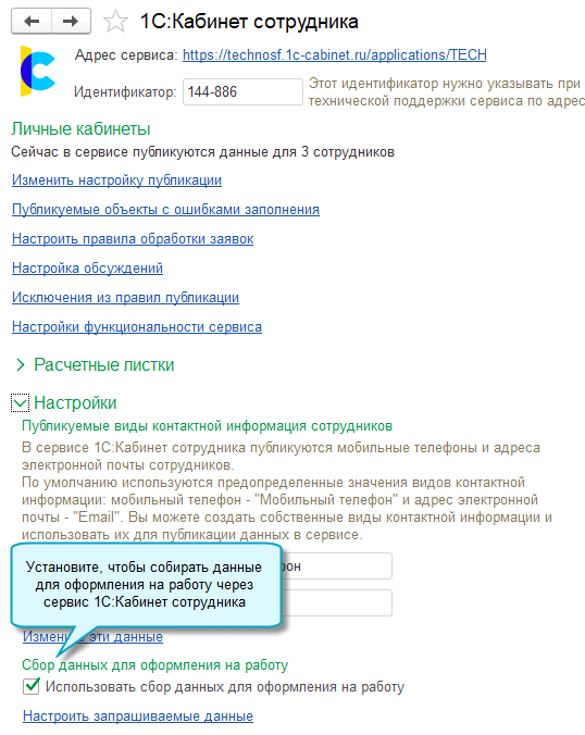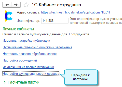 В программе «1С:Бухгалтерия 8» начиная с версии 3.0.185 теперь выполнить настройки функциональности сервиса 1С:Кабинет сотрудника можно не открывая сам сервис.