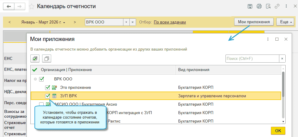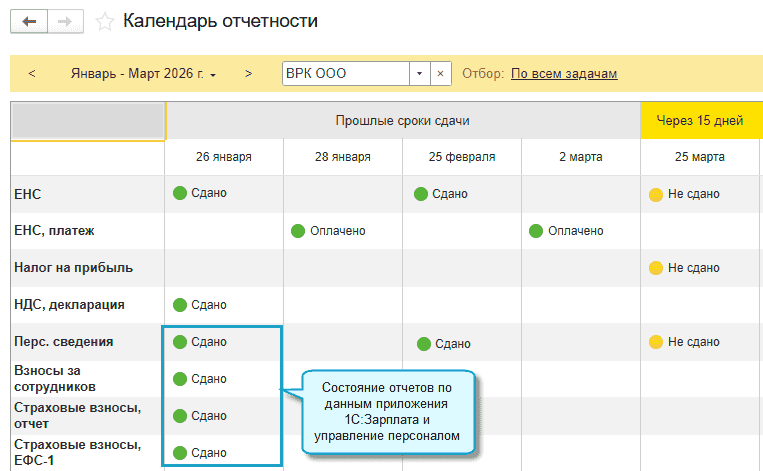 В программе «1С:Бухгалтерия 8» начиная с версии 3.0.194 добавлена возможность по календарю отчетности отслеживать сдачу отчетов, которые готовятся в приложениях «1С:Зарплата и управление персоналом».