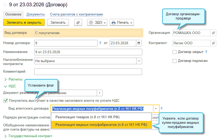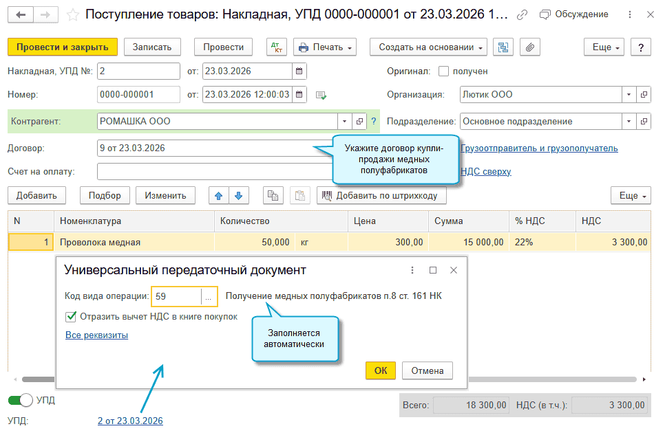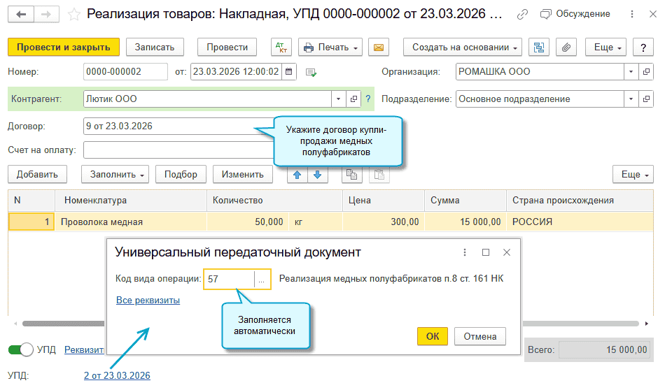 В программе «1С:Бухгалтерия 8» начиная с версии 3.0.195 добавлена возможность автозаполнения кодов операций НДС для книги продаж и книги покупок при реализации медных полуфабрикатов (письмо ФНС России от 16.01.2026 №СД-36-3/185@). Если производится корректировка реализации или поступления, то в корректировочных счета-фактурах (УКД) код потребуется указать вручную.