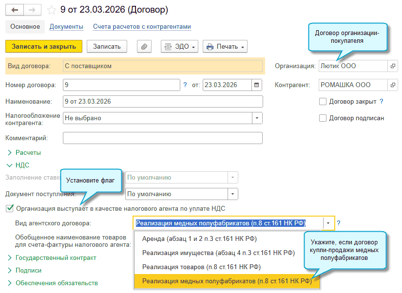 Функционал доступен в версии КОРП. Чтобы воспользоваться, достаточно выполнить настройку функциональности и указать в карточке договора его вид для НДС.