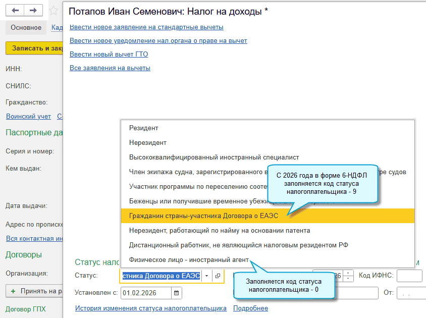 В программе «1С:Бухгалтерия 8» начиная с версии 3.0.192 обновлены коды статусов налогоплательщиков НДФЛ, используемые в форме 6-НДФЛ: