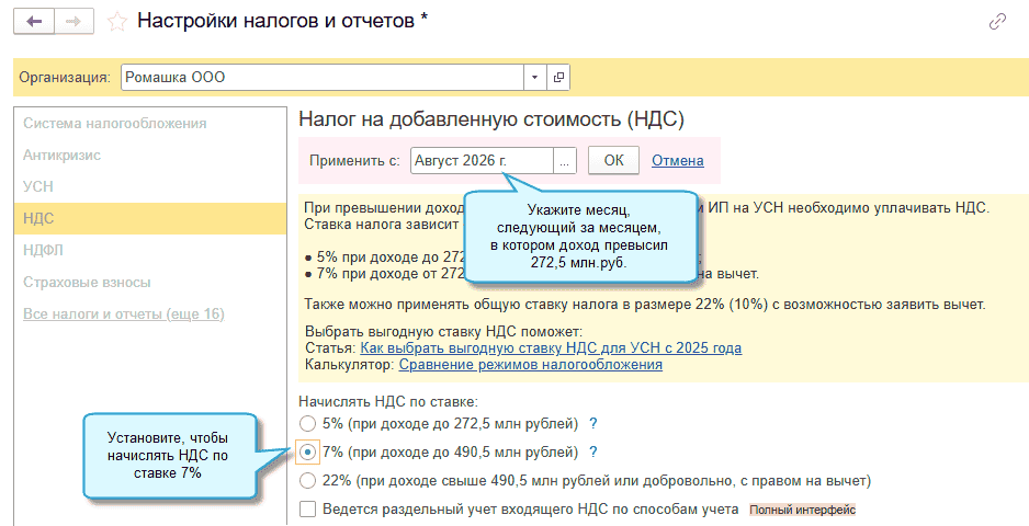 Полный интерфейс: меню «Главное – Настройки – Налоги и отчеты – НДС».